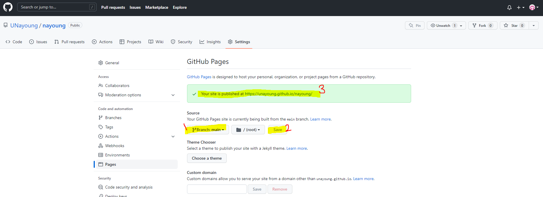 Setting → Pages 탭에서 main Branch를 선택한 후, Save 버튼을 클릭하면 위와 같이 페이지 주소가 발행된다.