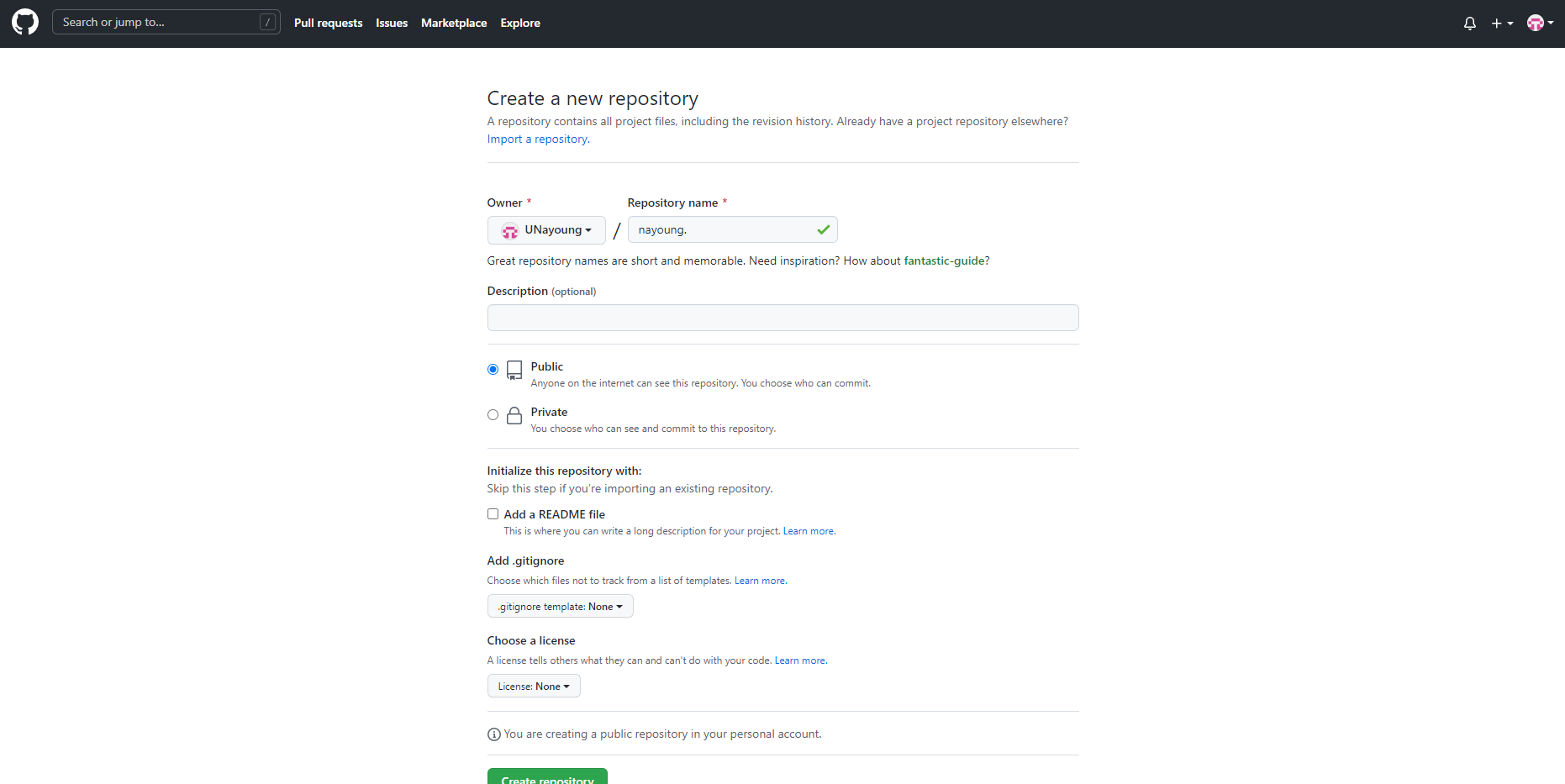 다음과 같이 접근 권한을 public으로 하여 레퍼지토리를 생성한다.